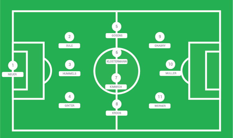 Low er glad for at anvende et 4-3-3 eller 3-4-3-system, hvor Kimmich sidder på midterbanen og beskytter forsvaret. Det giver spillere som Ilkay Gundogan, Toni Kroos og Goretzka frihed til at støtte angrebslinjen med Muller, Werner og Gnabry. Enten Hummels eller Antonio Rudiger holder fortet i det midterste forsvar, mens Havertz og Marco Reus begge kan indsættes fra bænken og bidrage med en farlig effekt. Med så meget talent er det en lidet misundelsesværdig opgave for Low at vælge det tyske EM-hold.